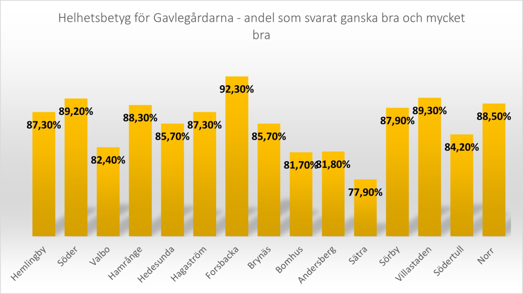 På det totala har resultatet för helhetsbetyget för Gavlegårdarna sjunkit något, men ser man till respektive bostadsområde är det fler som ligger långt över 80% än förra året, då denna fråga var ny för undersökningen.