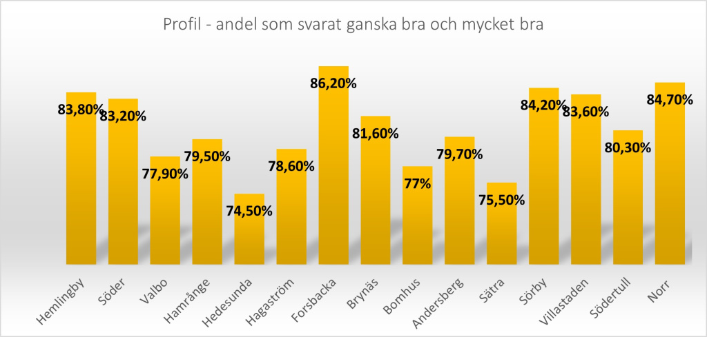 Inom profilavsnittet ligger vi på ungefär samma linje som tidigare år, vi har ökat med 1,5% sedan förra året gällande andelen som besvarat att vi är ganska bra och mycket bra, men i fritextsvaren kan vi se att det finns både negativa och positiva åsikter om Gavlegårdarna som hyresvärd – och att det finns ett behov av förbättringar inom service, underhåll och trygghet.